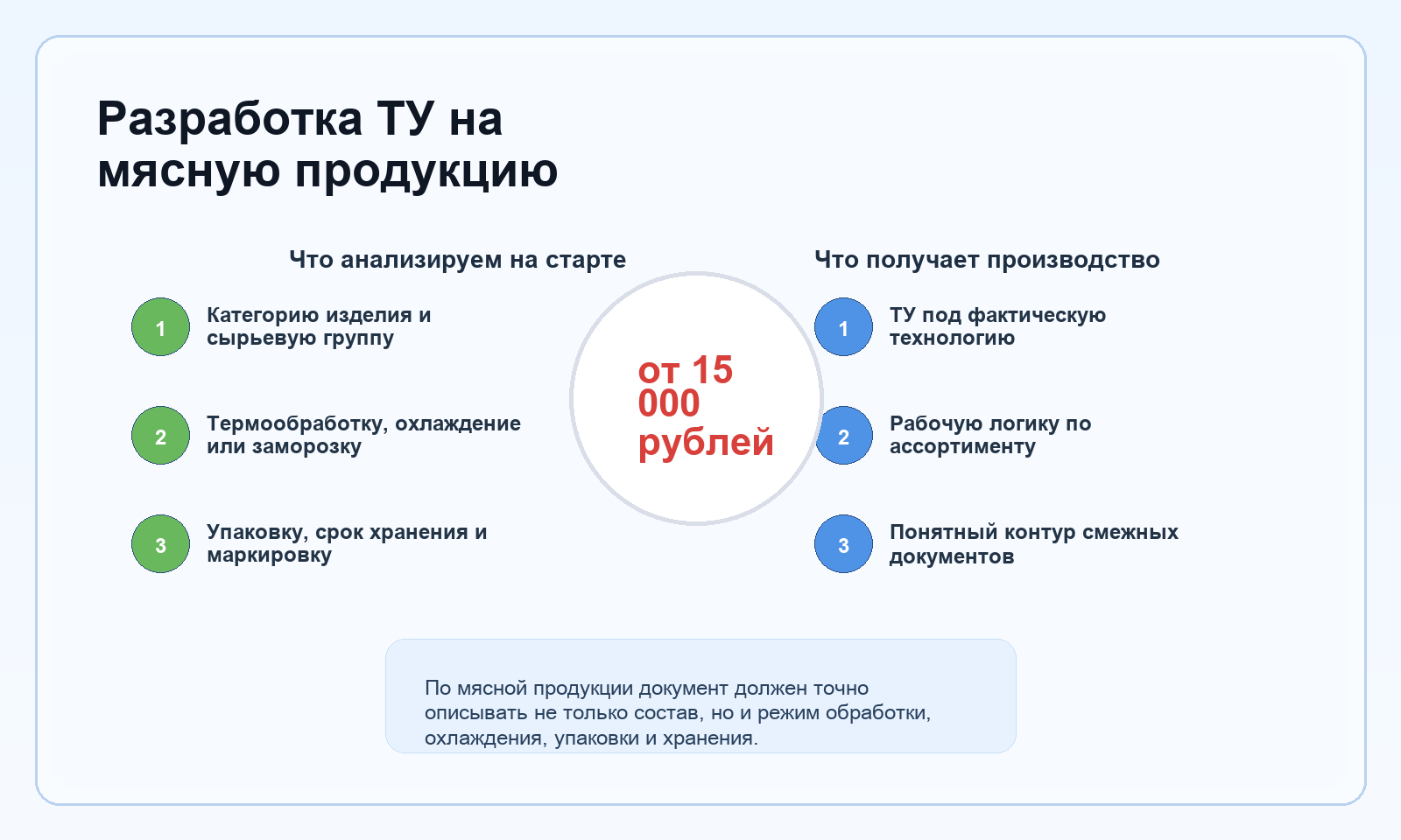 Присылайте перечень мясных изделий, которые нужно включить в проект, и базовые данные по рецептуре и упаковке. Этого достаточно, чтобы быстро определить границы документа и составить рабочий план.